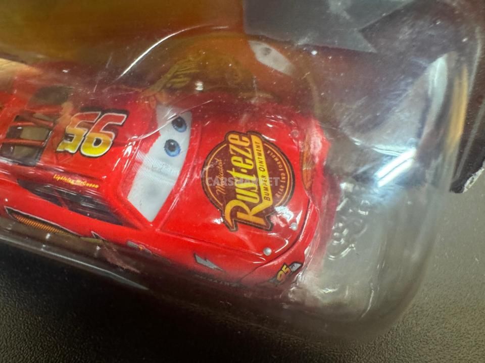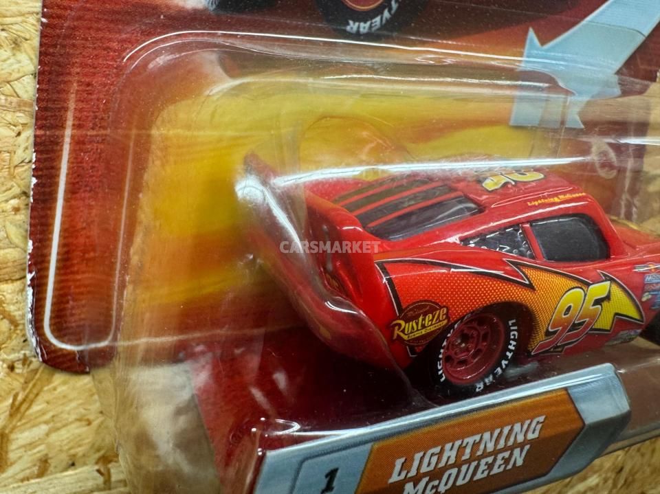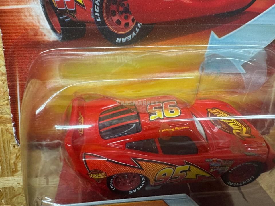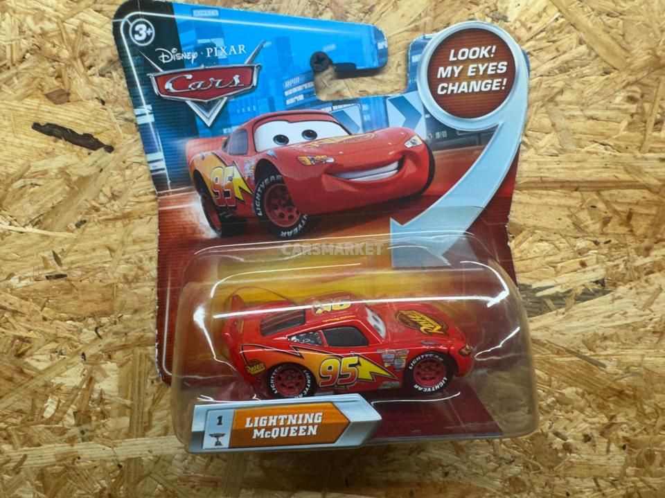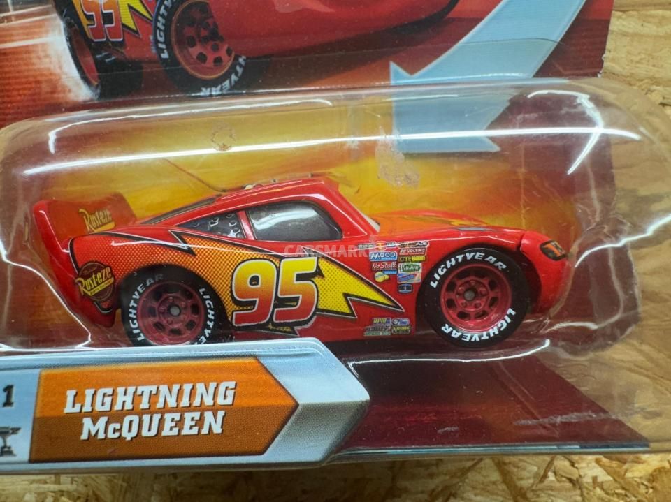 登場するのはライトニング・マックイーン。数え切れないほどのマックイーン・バリエーションの中でも、最もベーシックな “カーズ1仕様” の元祖マックイーンにあたります。「普通の」マックイーンながら、このモデルは目が動いて見えるレンチキュラー版